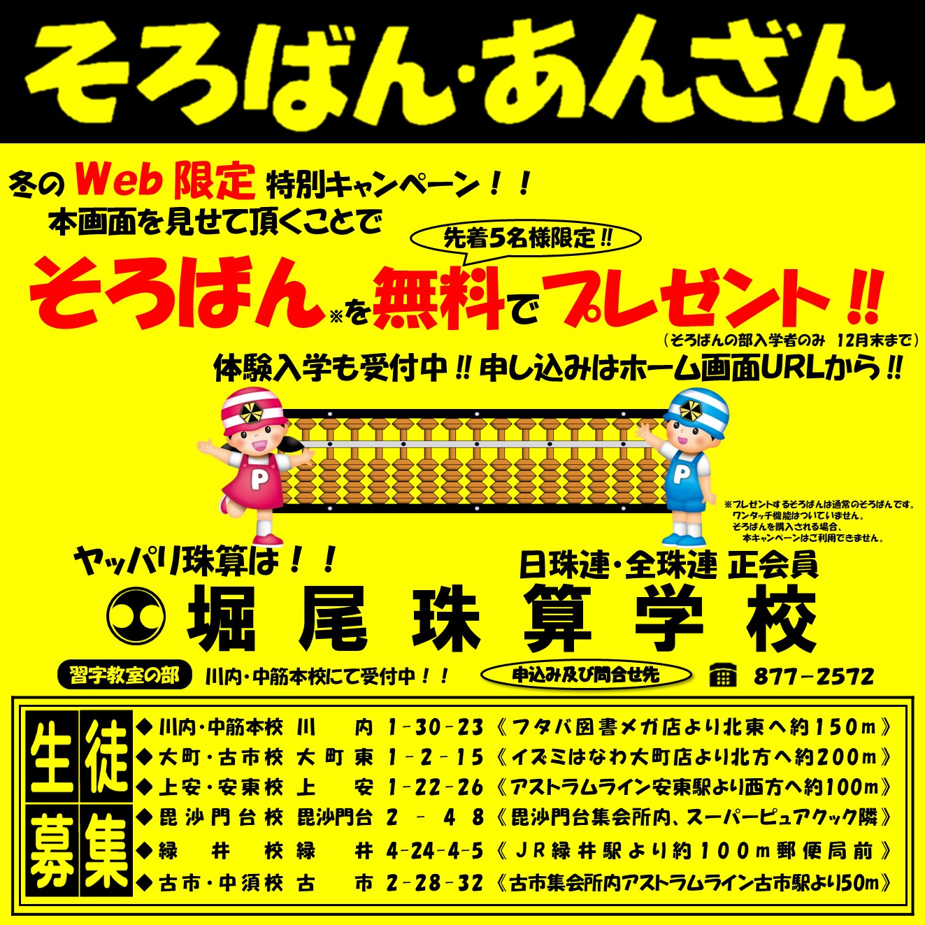 2024年:お知らせ 2024.12.24 【2024年11月】珠算検定試験合格者を掲載しました。 2024.11.29 冬のWeb限定特別キャンペーン!!本画面を見せて頂くことでそろばんを無料でプレゼント!先着5名様限定!詳しくはこちら 2024.11.29 【2024年11月23日】2024年 そろばんチャンピオンシップ広島の結果を掲載しました。 2024.11.29 【2024年10月】珠算検定試験合格者を掲載しました。 2024.10.31 【2024年10月20日】広島県通信珠算競技大会 安佐地区大会の結果を掲載しました。 2024.10.31 【2024年9月】珠算検定試験合格者を掲載しました。 2024.9.30 【2024年8月】珠算検定試験合格者を掲載しました。 2024.8.30 秋の特別キャンペーン!!広告持参で入学金無料!!10月末まで 詳しくはこちら 2024.8.30 【2024年7月】珠算検定試験合格者を掲載しました。 2024.7.31 【2024年6月】珠算検定試験合格者を掲載しました。 2024.6.28 夏のWeb限定特別キャンペーン!!本画面を見せて頂くことでそろばんを無料でプレゼント!先着5名様限定!詳しくはこちら 2024.6.28 【2024年5月】珠算検定試験合格者を掲載しました。 2024.5.30 【2024年4月】珠算検定試験合格者を掲載しました。 2024.5.30 【2024年4月29日】安佐地区珠算競技大会の結果を掲載しました。 2024.4.30 【2024年4月14日】広島県選抜珠算競技大会の結果を掲載しました。 2024.4.30 【2024年3月】珠算検定試験合格者を掲載しました。 2024.3.29 春の特別キャンペーン!!6月末まで 1日体験も受付中 問い合わせ・体験時に入学申込されると広告持参で授業料を半額免除!詳しくはこちら 2024.3.29 【2024年2月】珠算検定試験合格者を掲載しました。 2024.3.5 【2024年1月】珠算検定試験合格者を掲載しました。 2024.1.31 春の特別キャンペーン!!広告持参で1カ月授業料無料!3月末まで。体験入学も受付中!詳しくはこちら 2024.1.31 【2023年12月】珠算検定試験合格者を掲載しました。 2025年 2024年 2023年 2022年 2021年 2020年 2019年 2018年 2017年